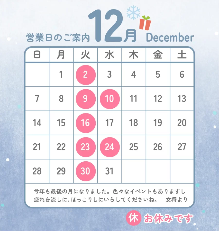 12月の営業日のお知らせ