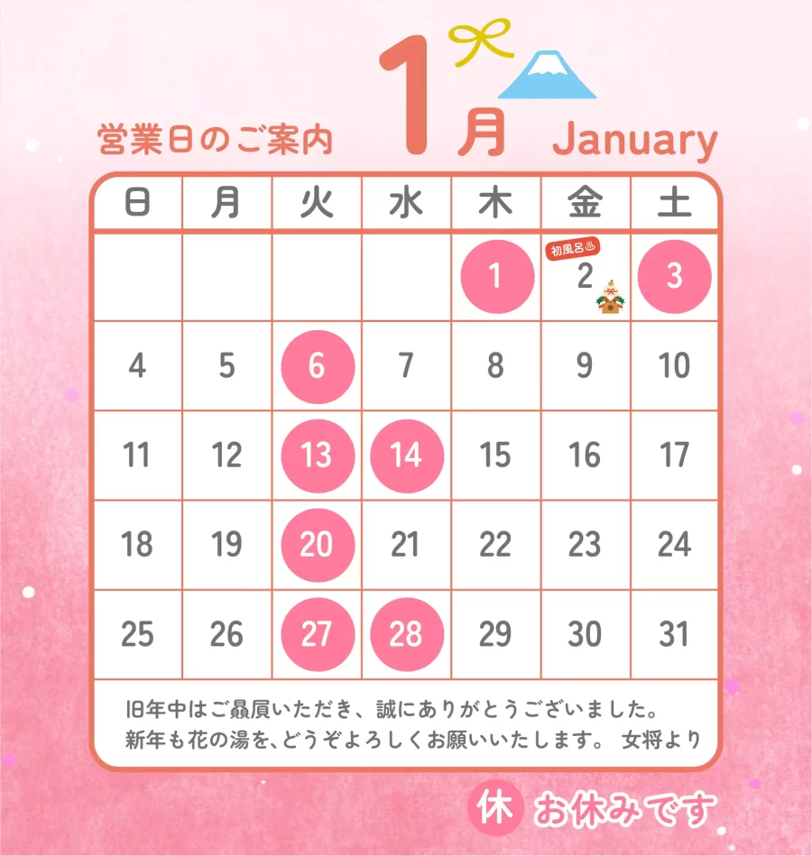 2026年1月の営業日のお知らせ