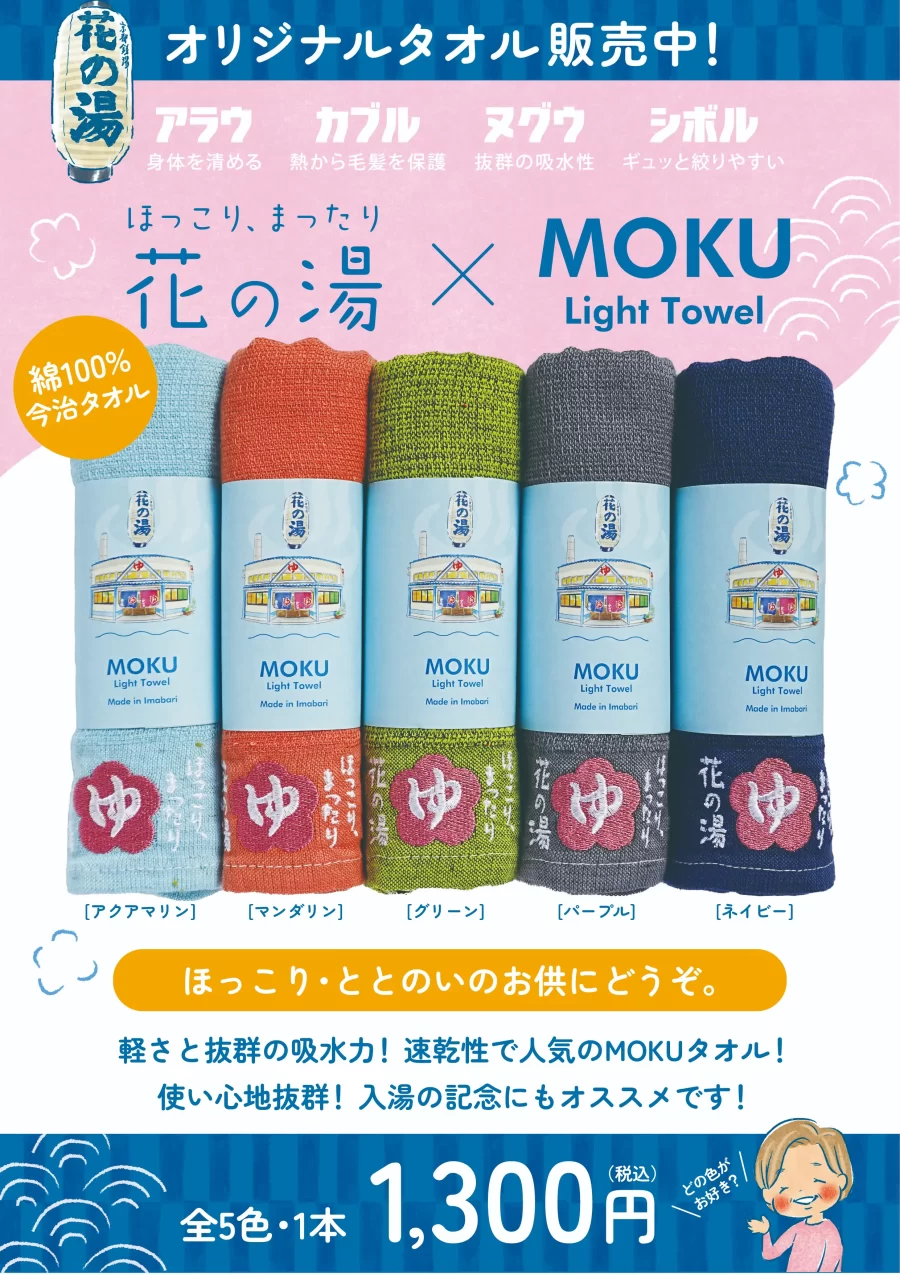 花の湯オリジナルMOKUタオル販売中!